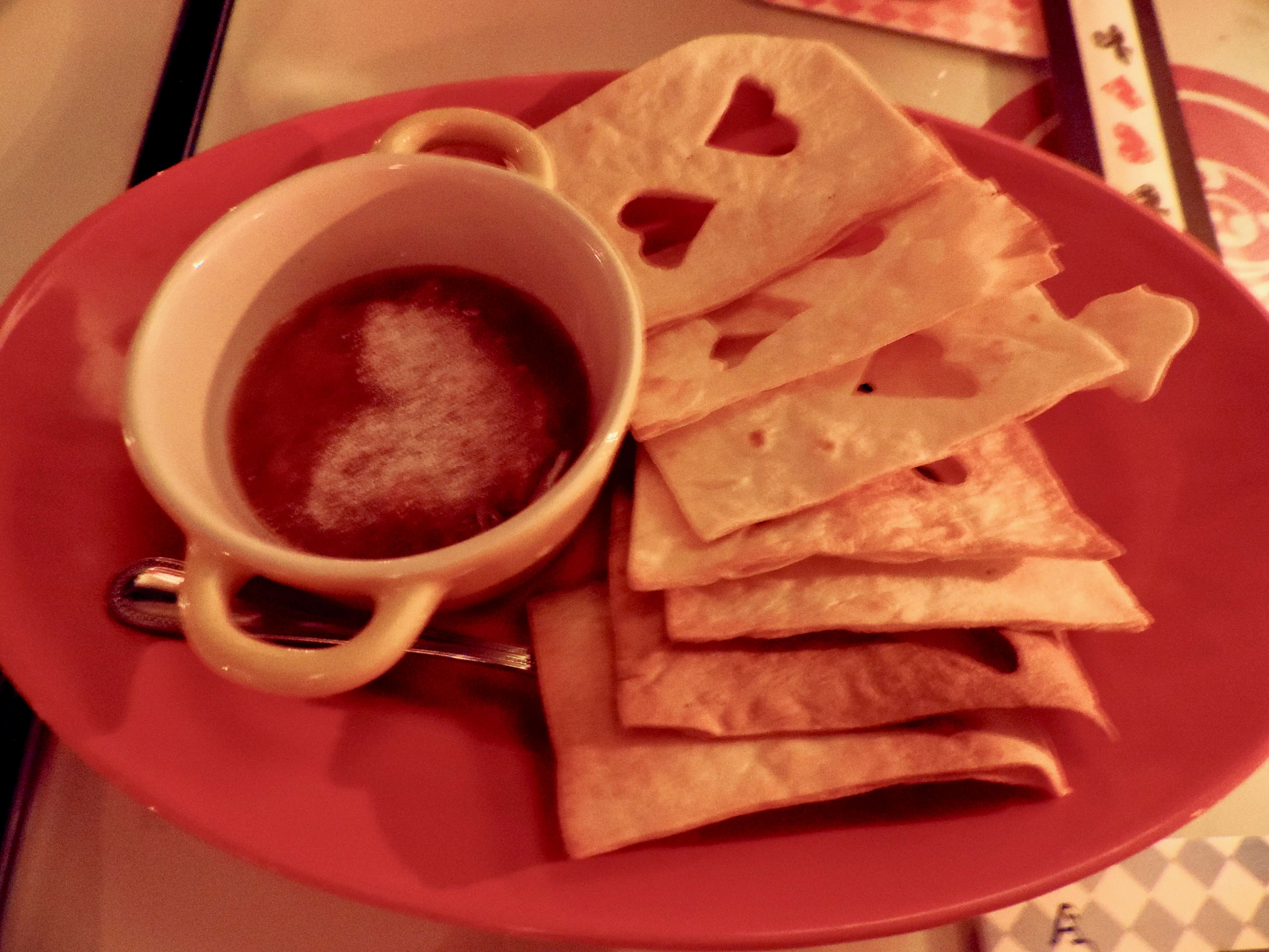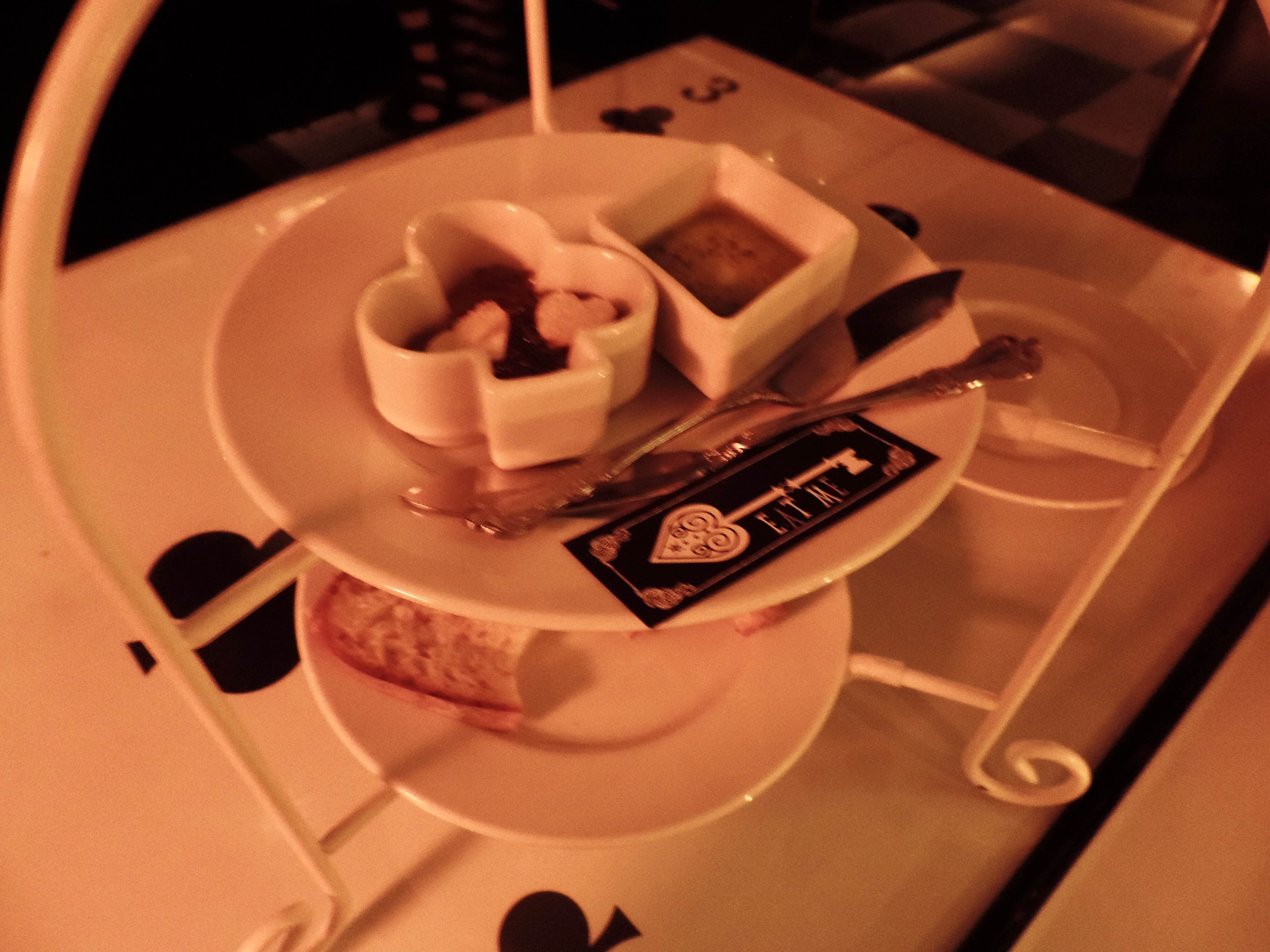 Next, our table got a serving tray of bread with sauce served in club- and diamond-shaped dishes. On the tray was a sign with an illustration of a key and the words “Eat Me” printed on it.