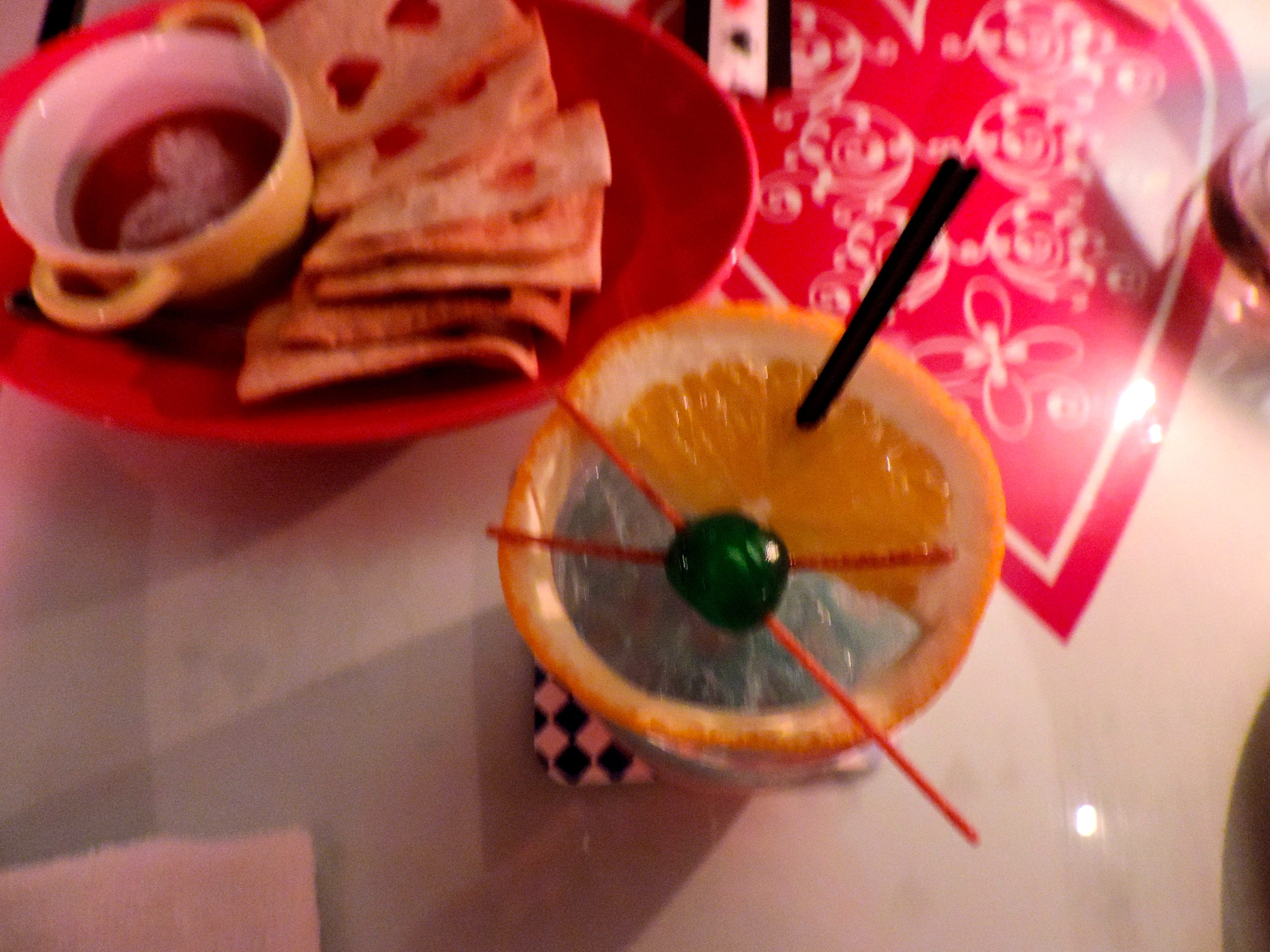 We first ordered drinks. I had the Cheshire Cat Smile cocktail, which was topped with an orange slice that had a cutout like a smiling mouth and a round sweet in the middle with skewers sticking out of it to make a cat nose and whiskers. So creative! Alice came over to the table to finish it off with ingredients procured from a small vial just like the one in the book.