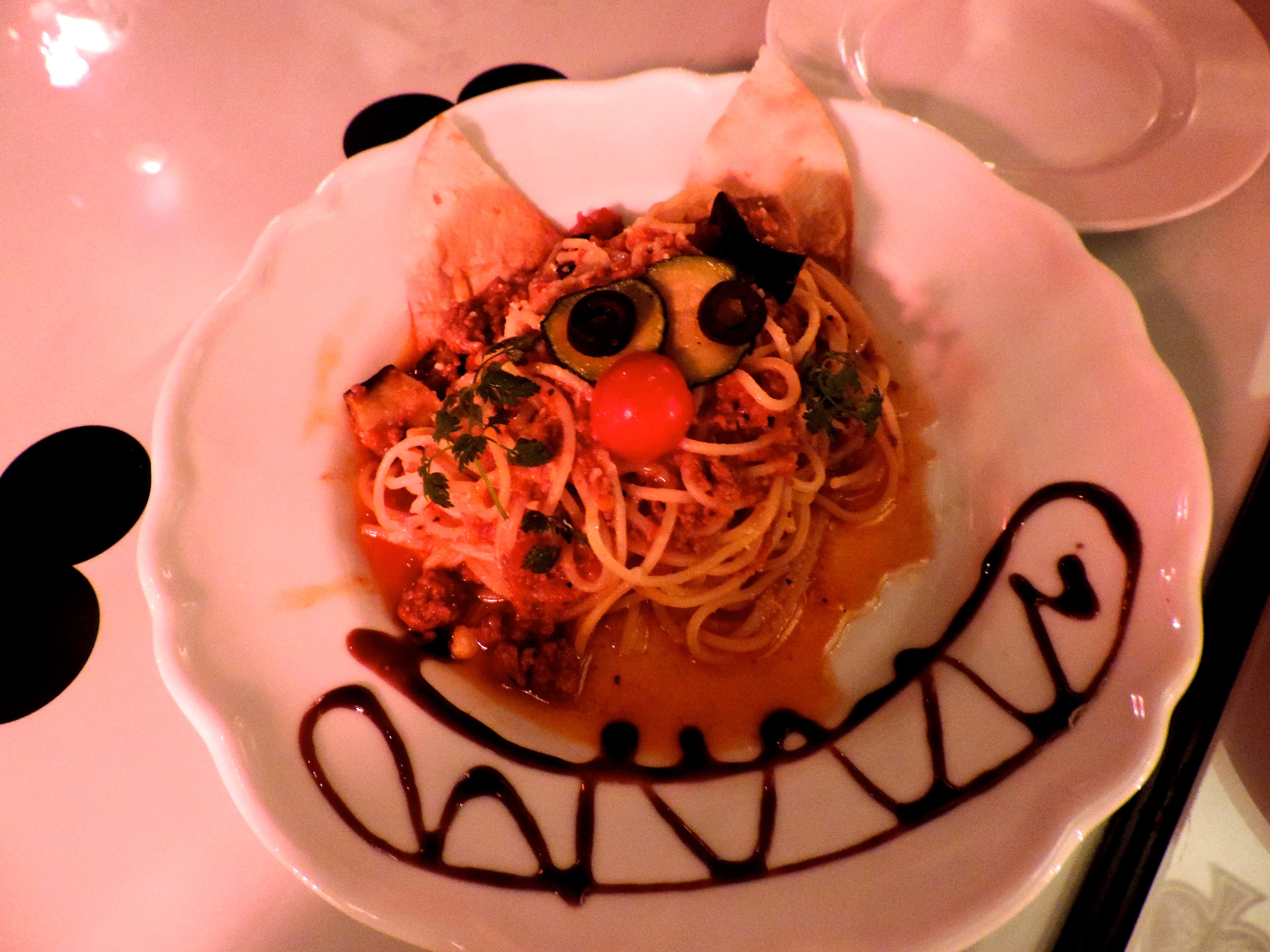 My friend had Cheshire Cat-shaped spaghetti that had two triangular pieces of bread for the ears, two zucchini slices topped with olives for the eyes, a cherry tomato for the nose, and a big zigzag spread of balsamic vinegar on the bottom of the plate to make the signature smile. We weren’t aware of it at the time, but we really did go all out with a Cheshire Cat-themed meal, didn’t we?
