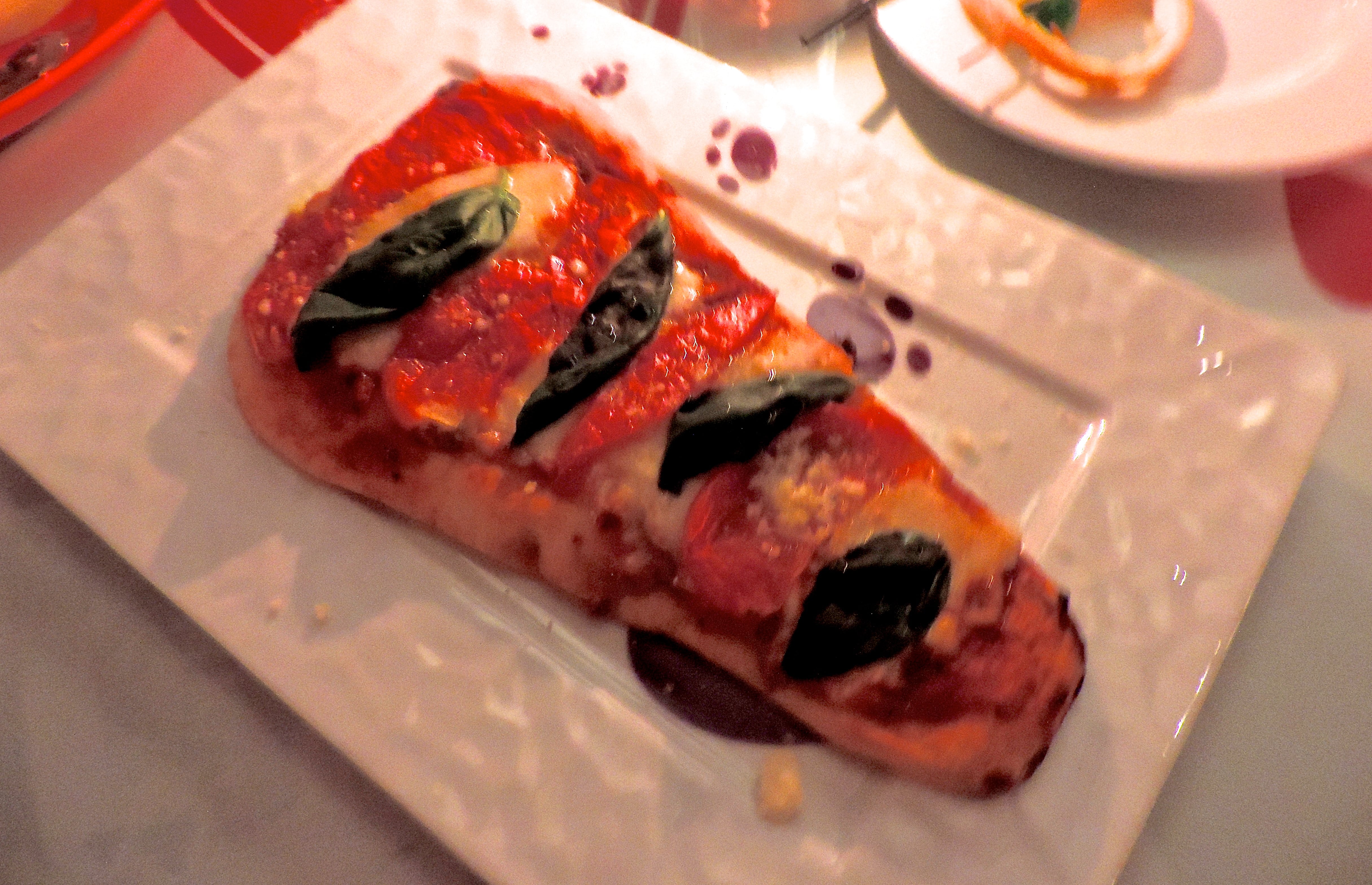 For the main course, I had a Cheshire Cat tail shaped pizza with tomatoes, mozzarella, and basil. It was quite yummy! Notice the little footprints on the plate.