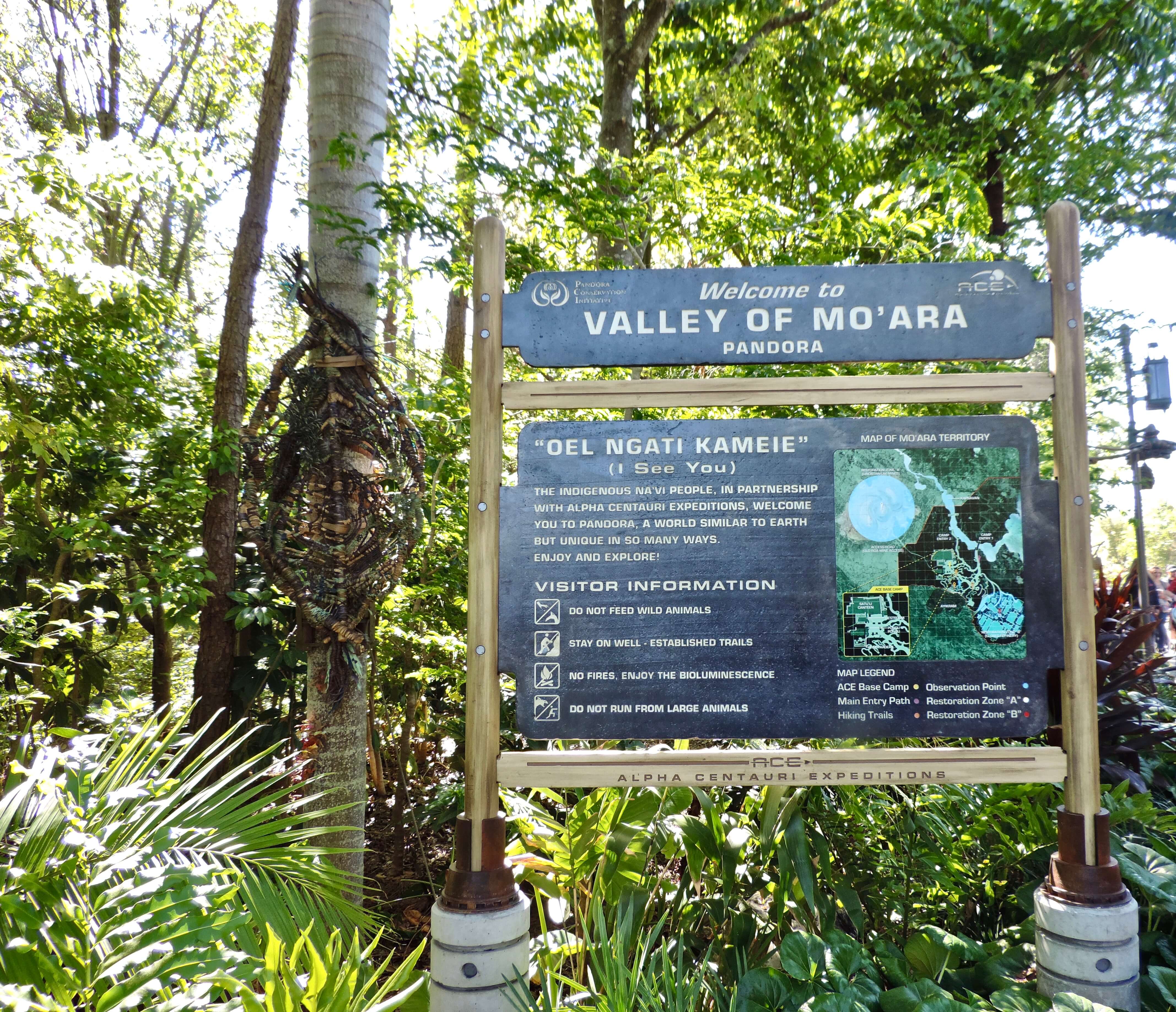 The entrance is marked by a sign from the fictional organization Alpha Centauri Expeditions detailing what can be seen in Valley of Mo’ara, the main area of Pandora.