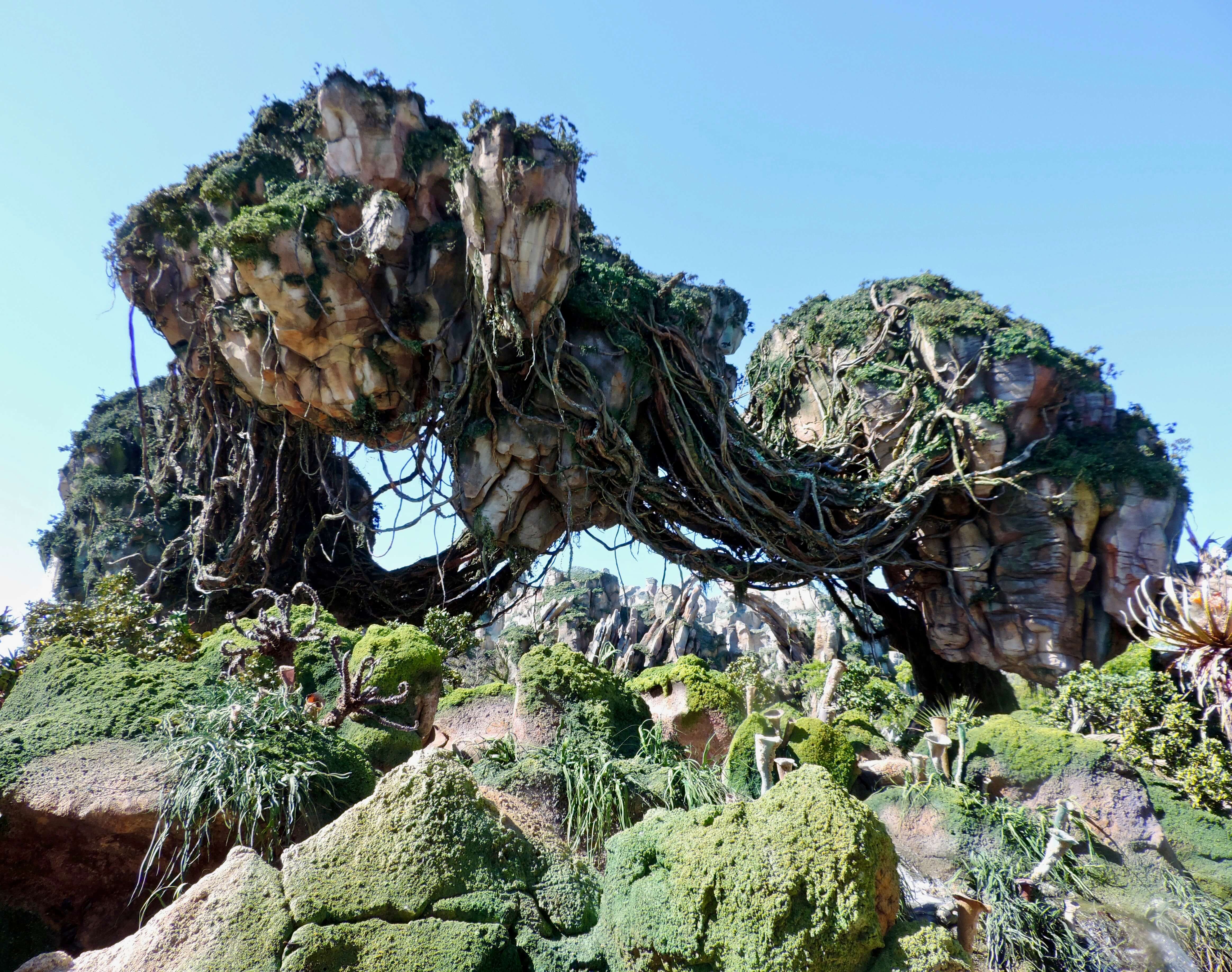 The second you set foot in the Valley of Mo’ara, it is total immersion. The focal point is the floating mountain range that soars into the sky above. At 156 feet/48 meters tall, the gargantuan structures are capped with green shrubs and have waterfalls cascading down the sides. It is quite a sight to behold.