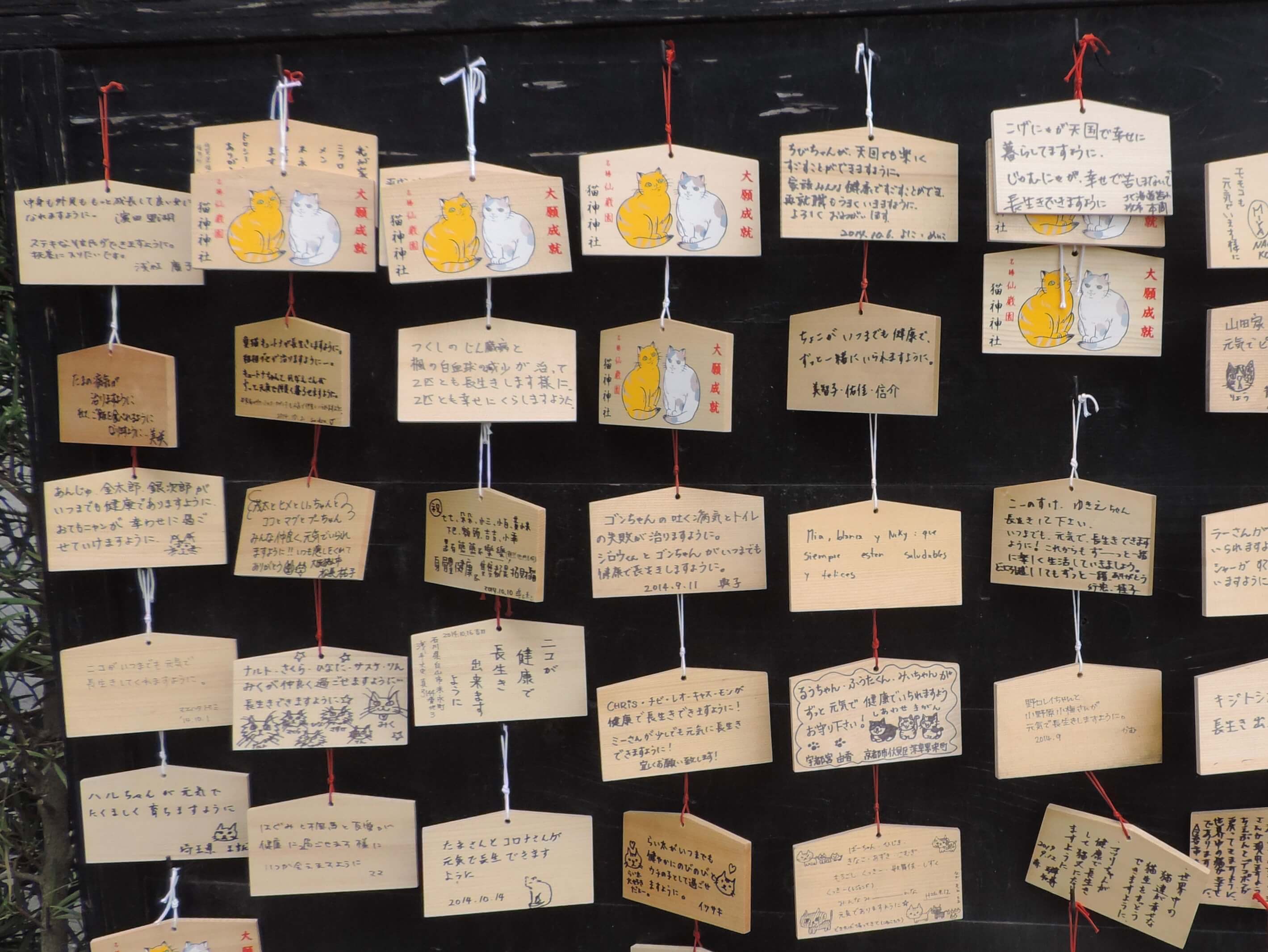 Ema tablets are set up next to the shrine so people can write wishes for their cats. I love the cat illustrations on them!
