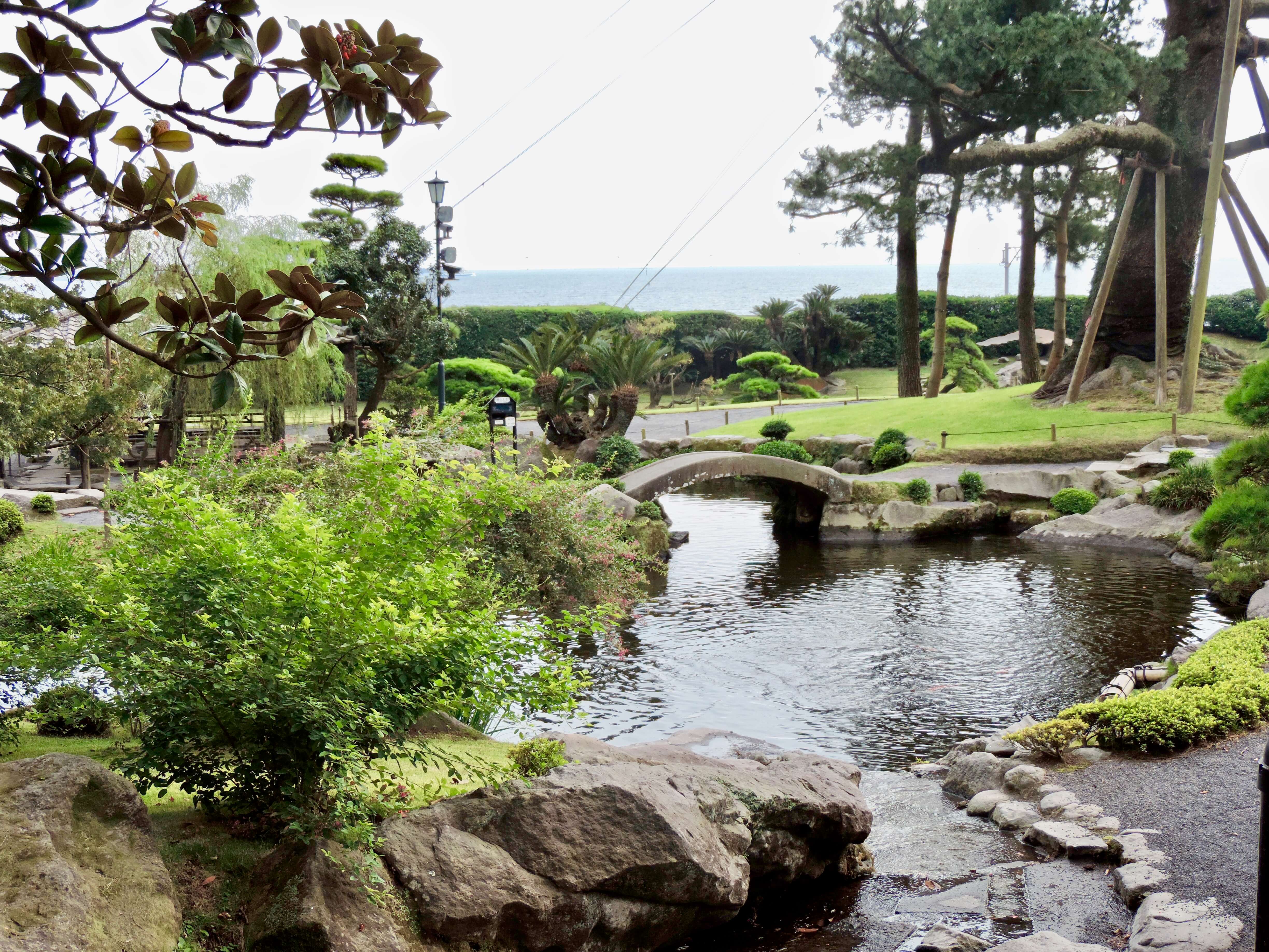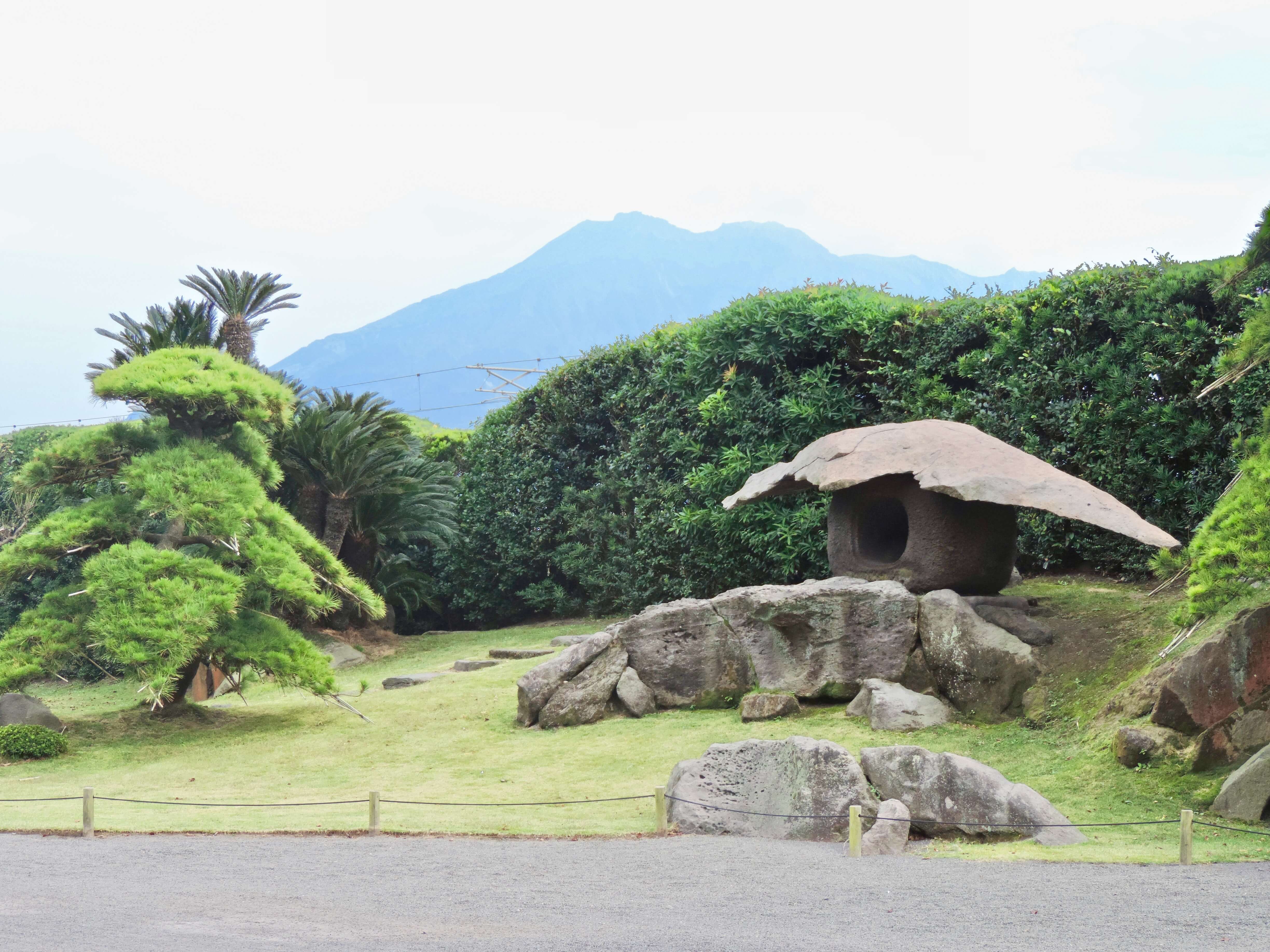 Thanks to the implementation of borrowed scenery, a landscaping device known as shakkei in Japanese, Kagoshima Bay and the active Sakurajima volcano in the distance provide stunning views from many angles of the property.