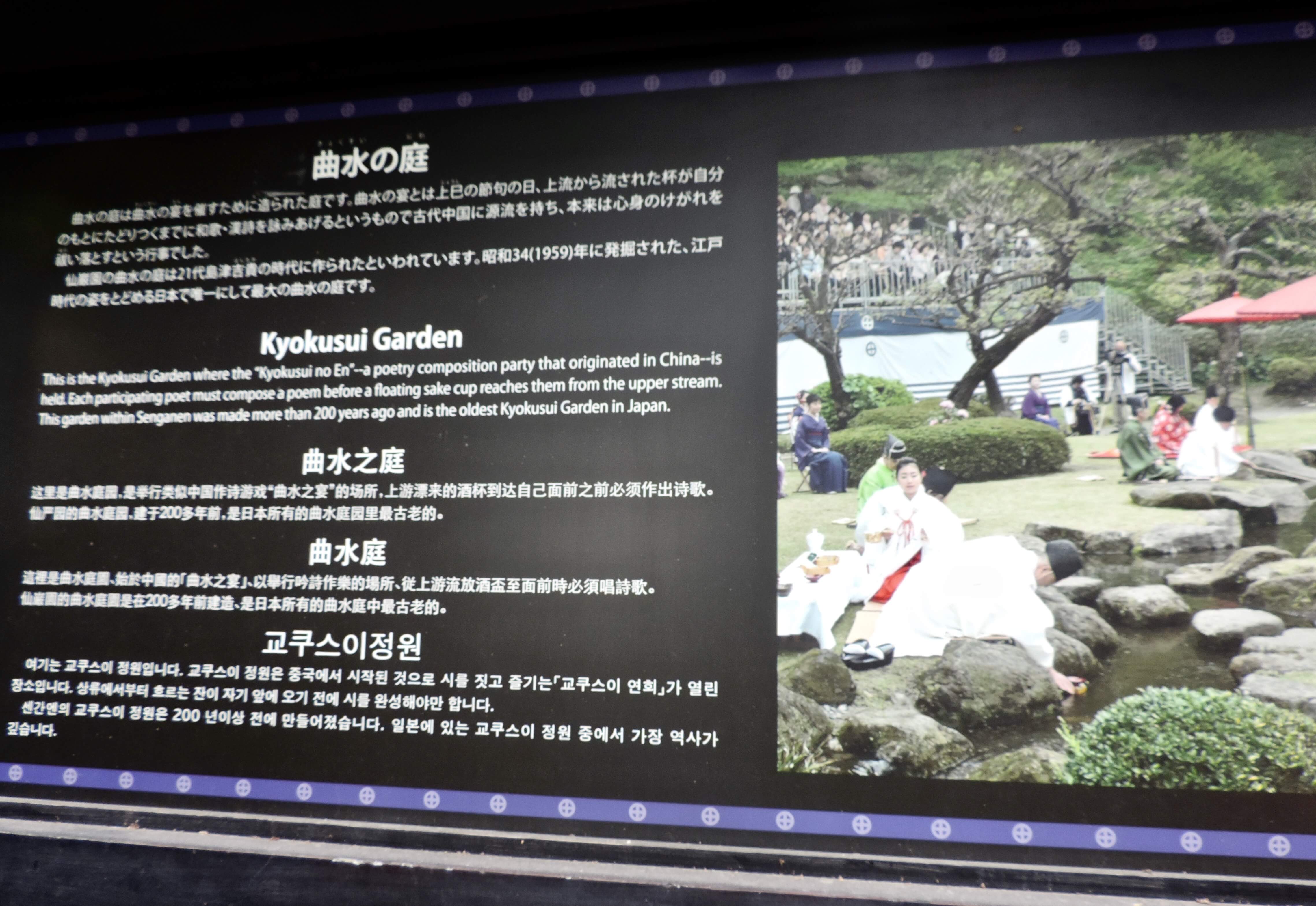 The Kyokusui Garden was designed for poetry parties. At these events, a sake cup would be placed at the top of the stream, and guests at the end of the stream had to compose a poem before the cup reached them. The Kyokusui Garden in Sengan-en is the oldest of its kind in Japan.