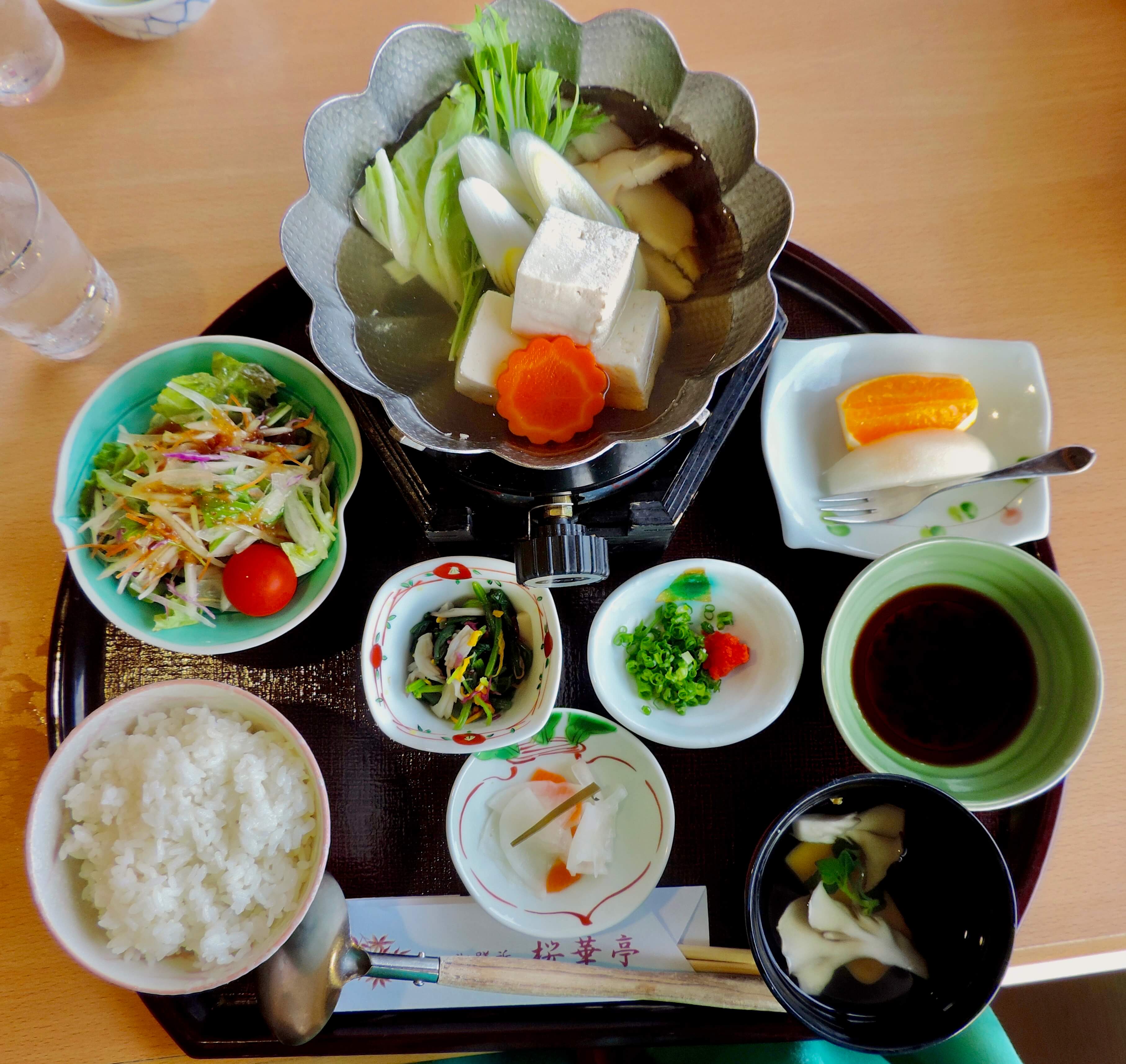 The staff generously prepared a vegetarian-friendly set lunch for me. It contained a bowl with a fire lit under it that had boiling tofu and veggies. Surrounding the large bowl were smaller bowls of rice, salad, seaweed, miso soup, and fruit. The presentation was as beautiful as the meal was delicious.